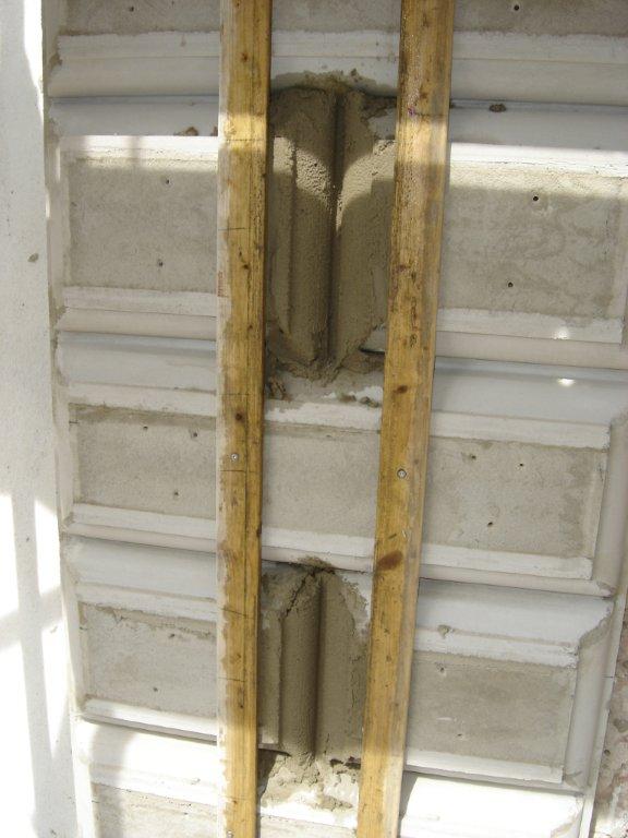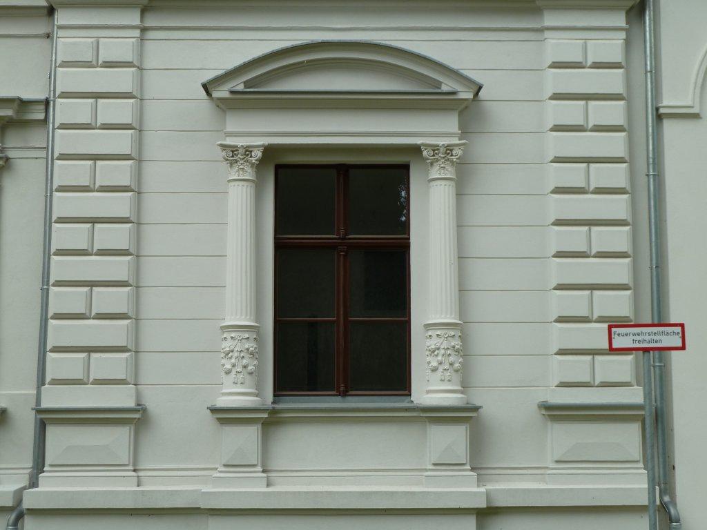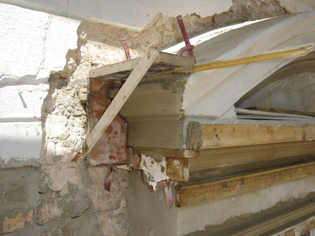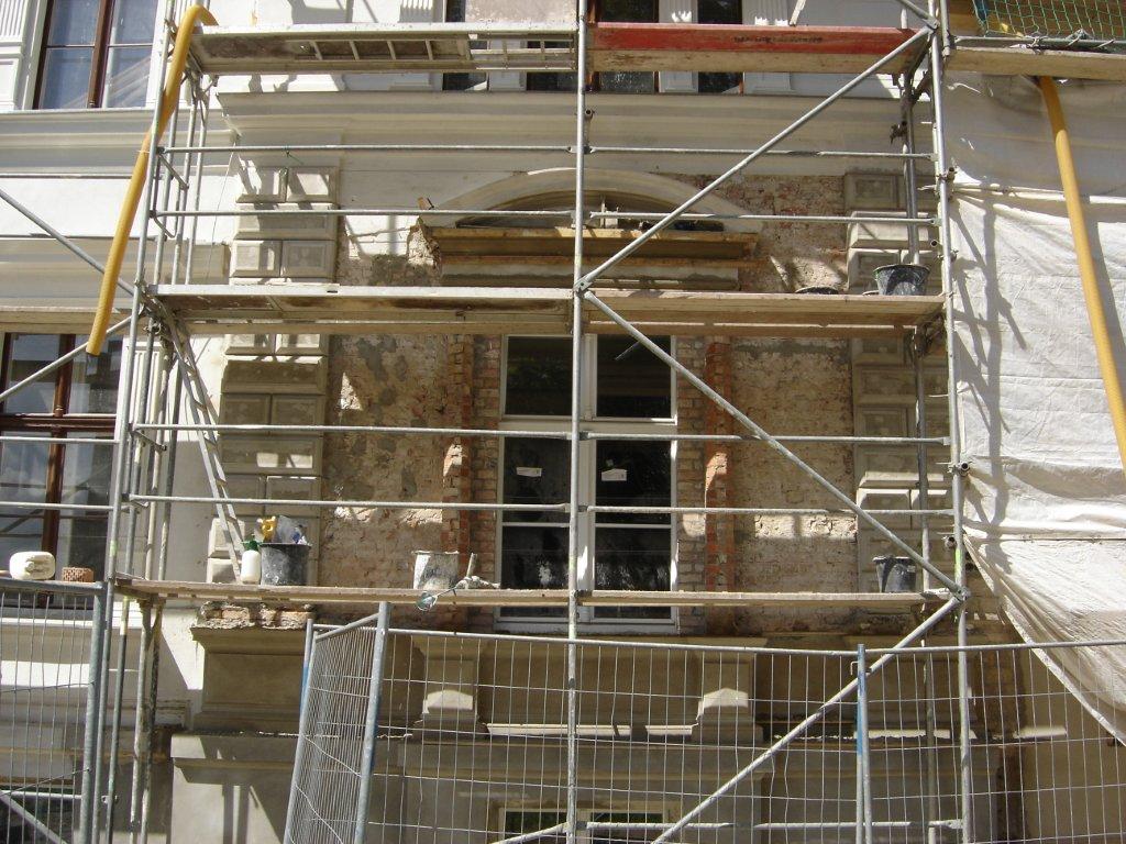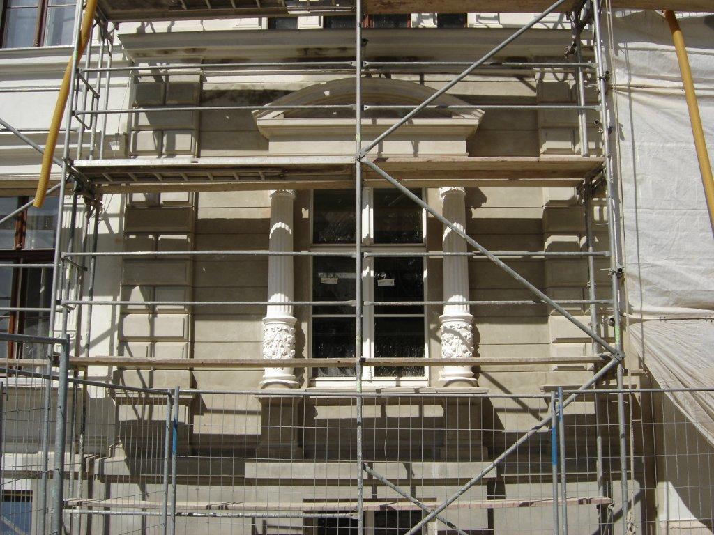 Vollständige Rekonstruktion des Fassadenabschnittes mit vor Ort hergestelltem profilierten Bossenputz, Nutenputz, Segmentgiebelverdachungen und dreigliedrigen Säulen.